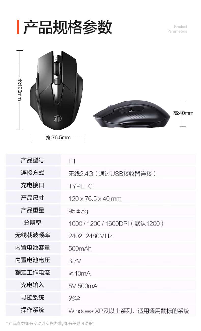 英菲克(INPHIC)F1无线鼠标可充电轻音办公人体工学电脑